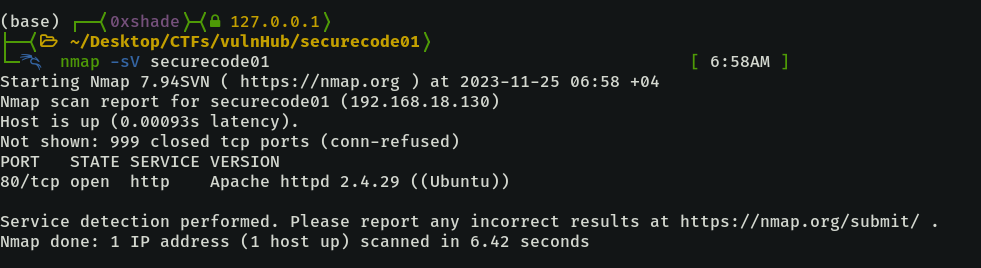 A port scan on the machine reveals that only port 80 is open, running an apache webserver version 2.4.29
