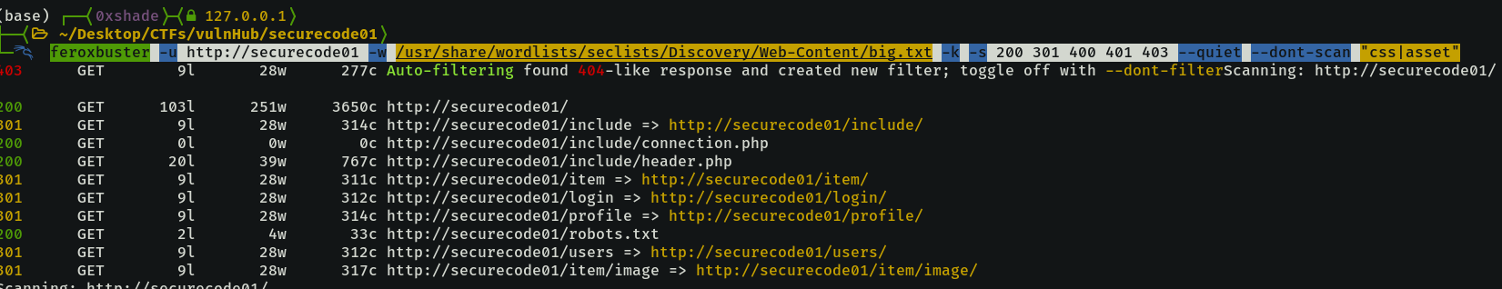 feroxbuster -u http://securecode01 -w /usr/share/wordlists/seclists/Discovery/Web-Content/big.txt -k -s 200 301 400 401 403 --quiet --dont-scan "css|asset"