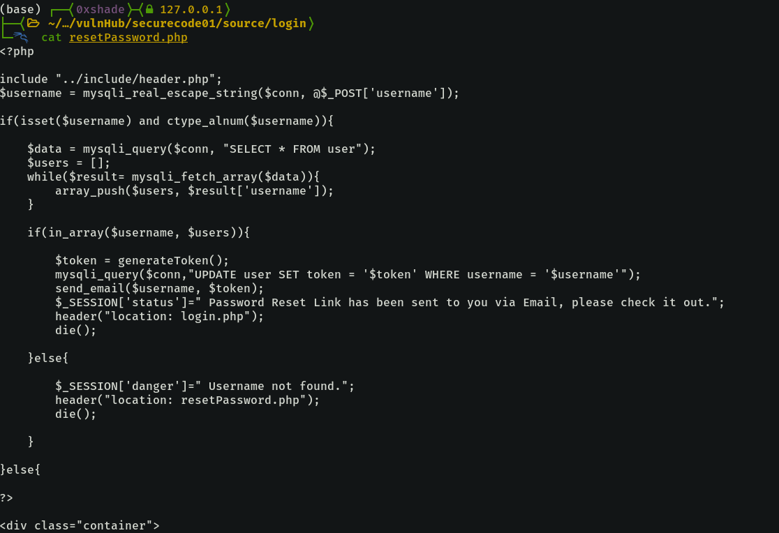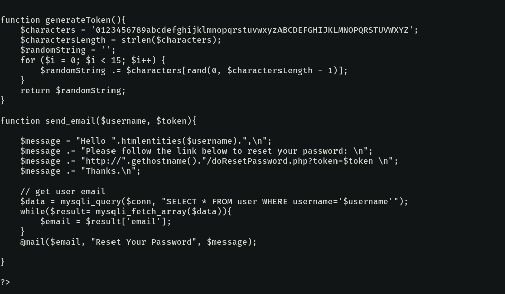 The reset password page starts with sanitizing the username with mysqli_real_escape_string function, which does a pretty good job at stopping SQLi with quoted literals. After that, it checks that the username field is set and that the username is alphanumerical, if not then it doesn’t execute the whole block.